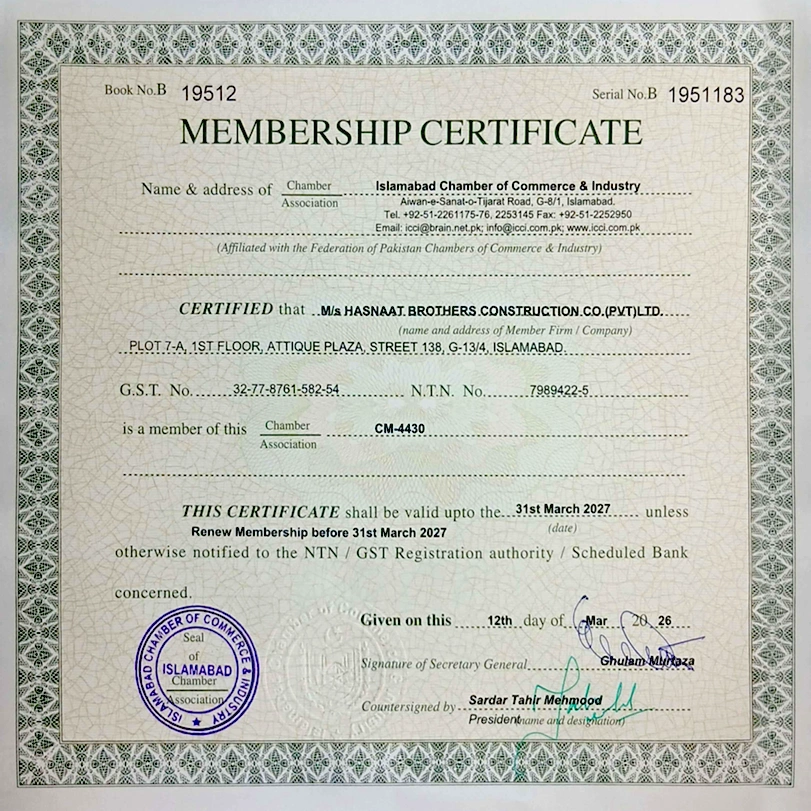 Hasnaat Brothers is certified and accredited by leading industry bodies, demonstrating our dedication to quality, safety, and excellence in every construction project.